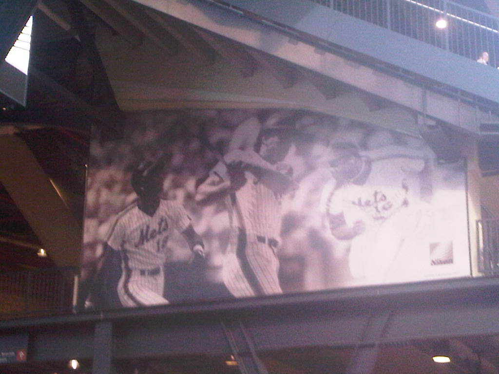 Though I clearly have an affinity for The Boys of Summer, working on developing an HBO-style TV series about Dem Bums and the borough they played in, I completely agree with the sentiment that there was an extreme lack of Metsian pizazz. The Mets heard those calls and responded, at first by installing sepia photos of the ’69 and ’86 teams throughout the ballpark, then in 2010 by installing the Mets Hall of Fame, both good moves (that shouldn’t have taken fans complaining to happen). Color Photos, including large trading cards, have made their way throughout the ballpark and along the Citi Field plaza. The stairways and bathrooms, which were void of color, now have coats of orange and blue paint. And of course, when they did change the dimensions, the outfield walls were turned blue.